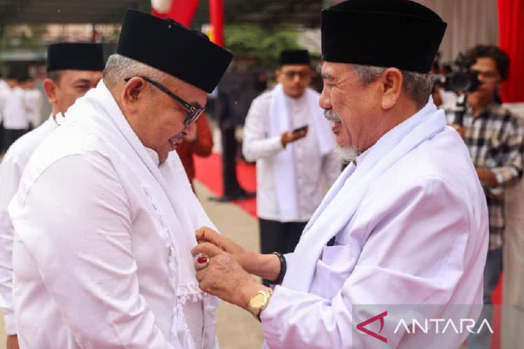 TIMES Sragen/Pimpinan pesantren Insafuddin Banda Aceh memberikan kain kepada Sekda Aceh Bustami Hamzah usai peringati Hari Santri, di Banda Aceh, Selasa (24/10/2023). (FOTO: ANTARA/HO/Humas Pemprov Aceh)