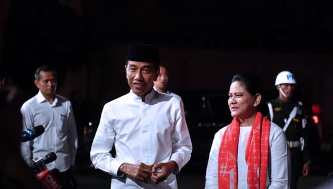 TIMES Sragen/Capres nomor urut 01 Joko Widodo bersama istri Iriana Joko Widodo tiba di lokasi untuk mengikuti debat Pilpres 2019 putaran kelima, di Hotel Sultan, Jakarta, Sabtu (13/4/2019). (FOTO: Rivan Awal Lingga/Antarafoto)
