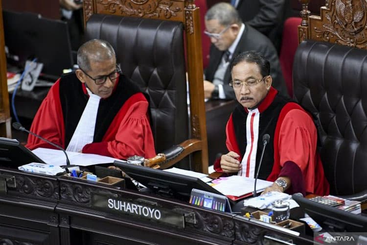 TIMES Sragen/Ketua Mahkamah Konstitusi (MK) Suhartoyo (kanan) bersama Wakil Ketua MK Saldi Isra memimpin sidang pengucapan putusan perkara dilanjutkan atau tidak (dismissal) sengketa Pilkada 2024 di Gedung Mahkamah Konstitusi, Jakarta, Rabu (5/2/2025). (ANTARA)